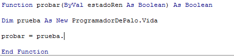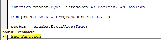 Function probar(ByVal estadoRen As Boolean) As Boolean Dim prueba As New ProgramadorDePalo.Vida probar = prueba.EstarVivo(True) End Function